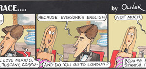 Signed, Limited Edition Strip cartoon print from The Field Magazine. Size : 20.5 x 10.5 inches (52 x 26.5 cm) mounted with cream mount board. “Do you get abroad much?” “We love Meribel, Ibizia, Tuscany, Corfu..” …” Because everyone’s English.” ” And do you go to London ?”… ” Not much”…. ” Because everyone’s French, Spanish, Italian and Greek.” From an edition of 850.